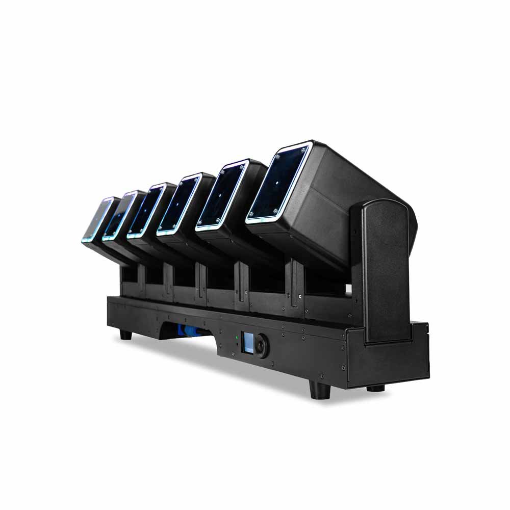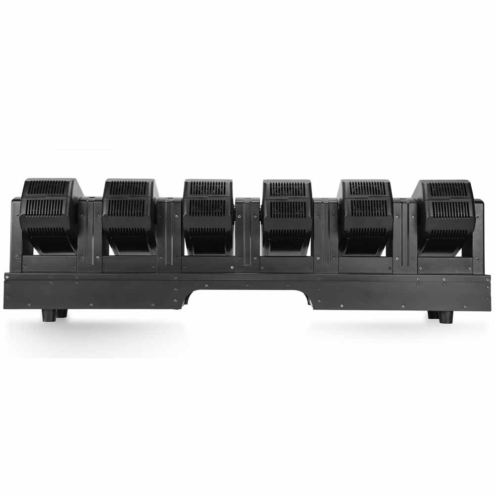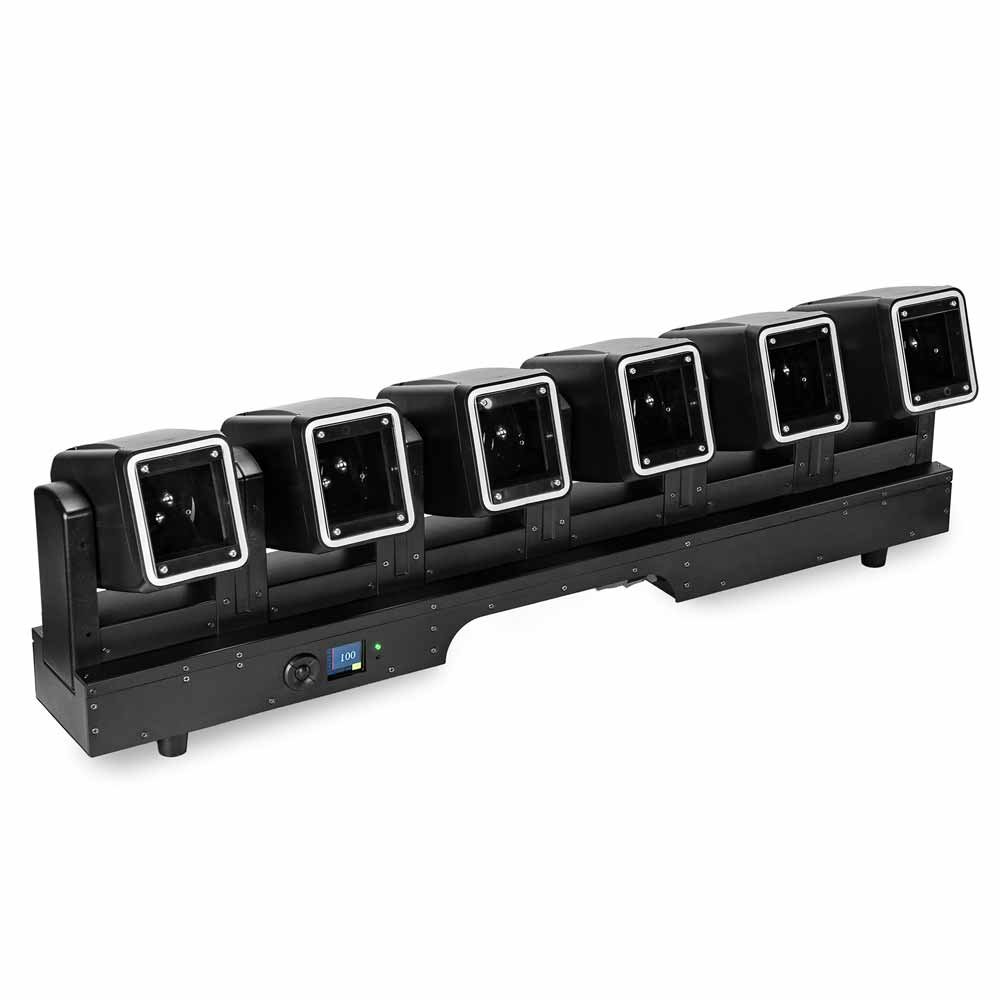 This fixture uses a linear bar design that integrates six independently controlled moving head units into a single reinforced metal housing.